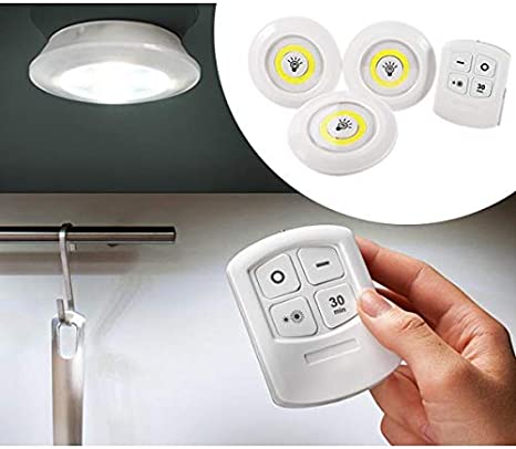 LED light with remote control Battery operated Pack of 3 Supplied with batteries on and tested. Can be turned on manually or remotely. 2 lighting levels It also has a 30-minute timer option on (it turns off after that time). Each spotlight requires 3 AAA batteries, and the 2 AAA type remote control. The 11 are easy to put on.